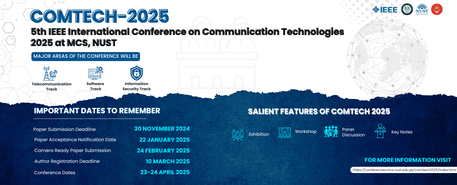 Military College of Signals (MCS), a Campus of National University of Sciences and Technology (NUST), is dedicated to advancing knowledge and educating students in science and technology. As part of its continuing pursuit for excellence in research, MCS is Organizing an International Conference on Communications Technologies (ComTech-2023), at its campus, in collaboration with IEEE and related industrial partners. The Conference will be focusing on the future roadmap of Telecommunication, Software Engineering & Information/Cyber Security to meet the real world challenges in these fields of Technology.